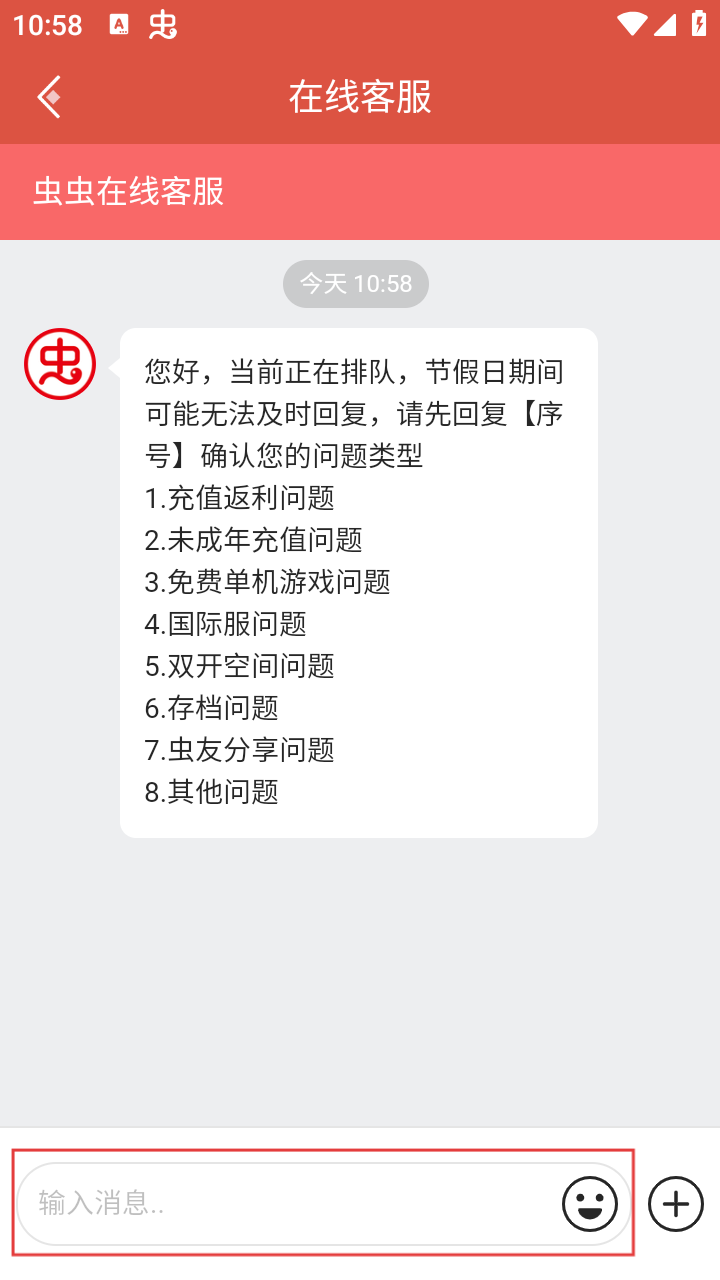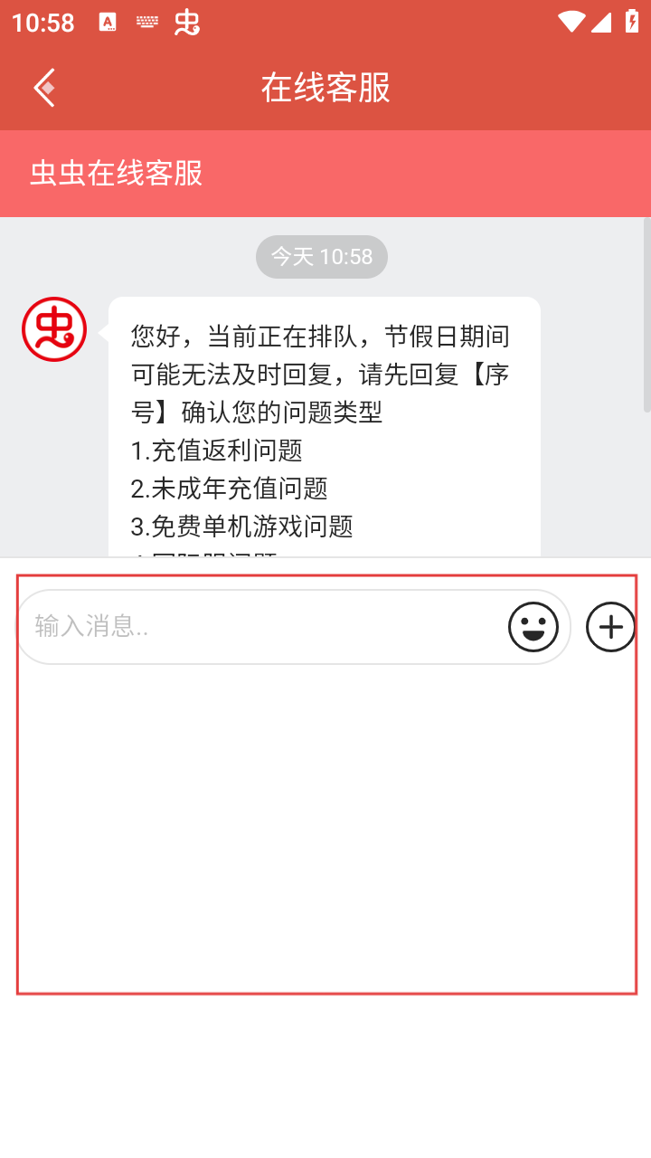3、进入在线客服页面,可看到客服发送的问题类型提示,点击底部输入框,准备输入问题。