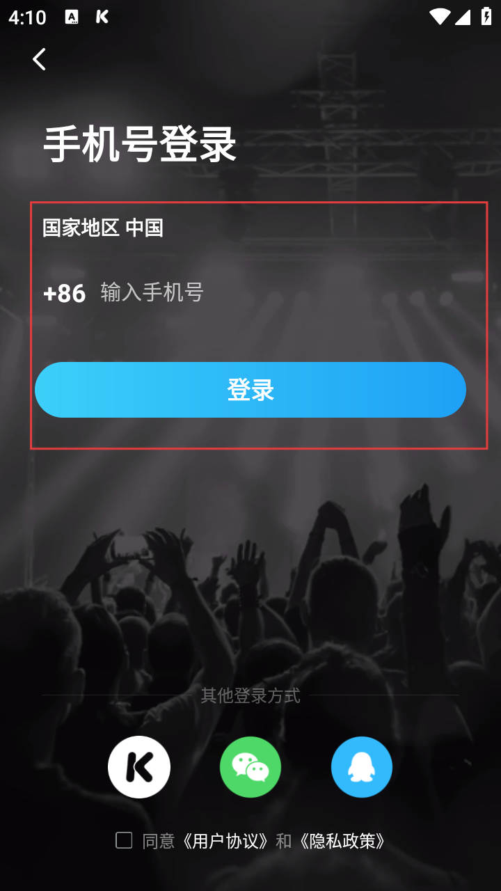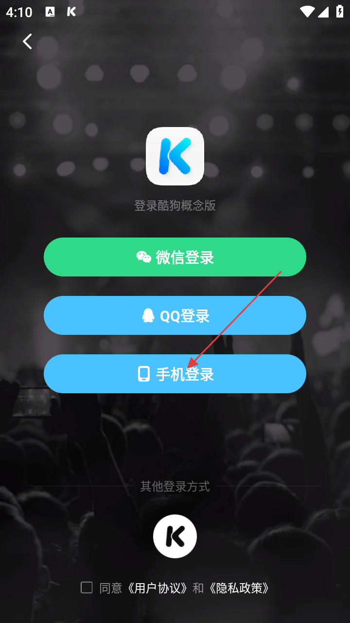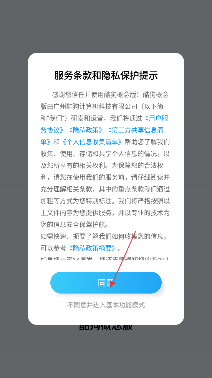 1、打开酷狗概念版APP,在服务条款和隐私保护提示页面,点击【同意】按钮,进入登录页面。