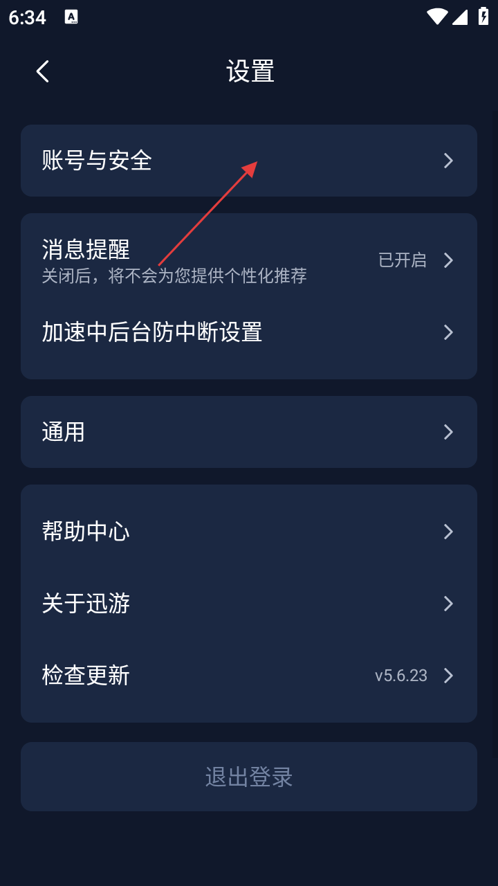 3、在设置页面,点击【账号与安全】选项,可进入账号安全相关设置界面。