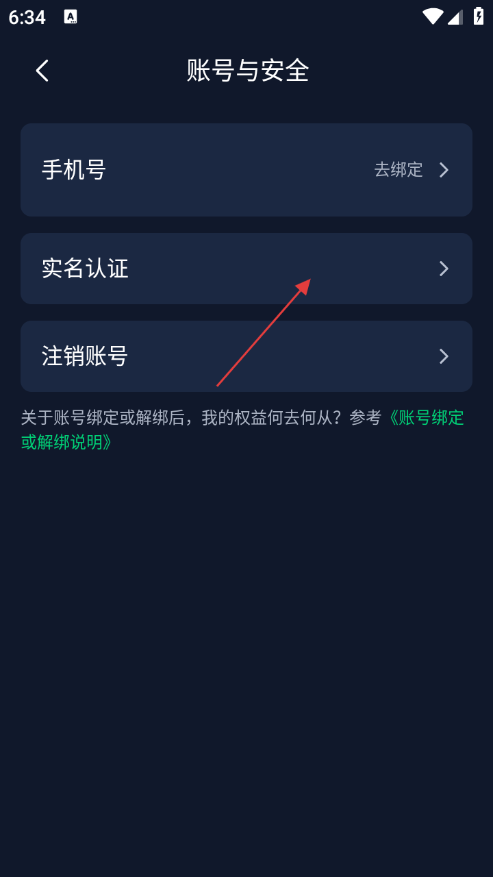 4、在【账号与安全】界面,可进行【实名认证】操作,同时还可进行手机号绑定及账号注销,保障账号安全合规。