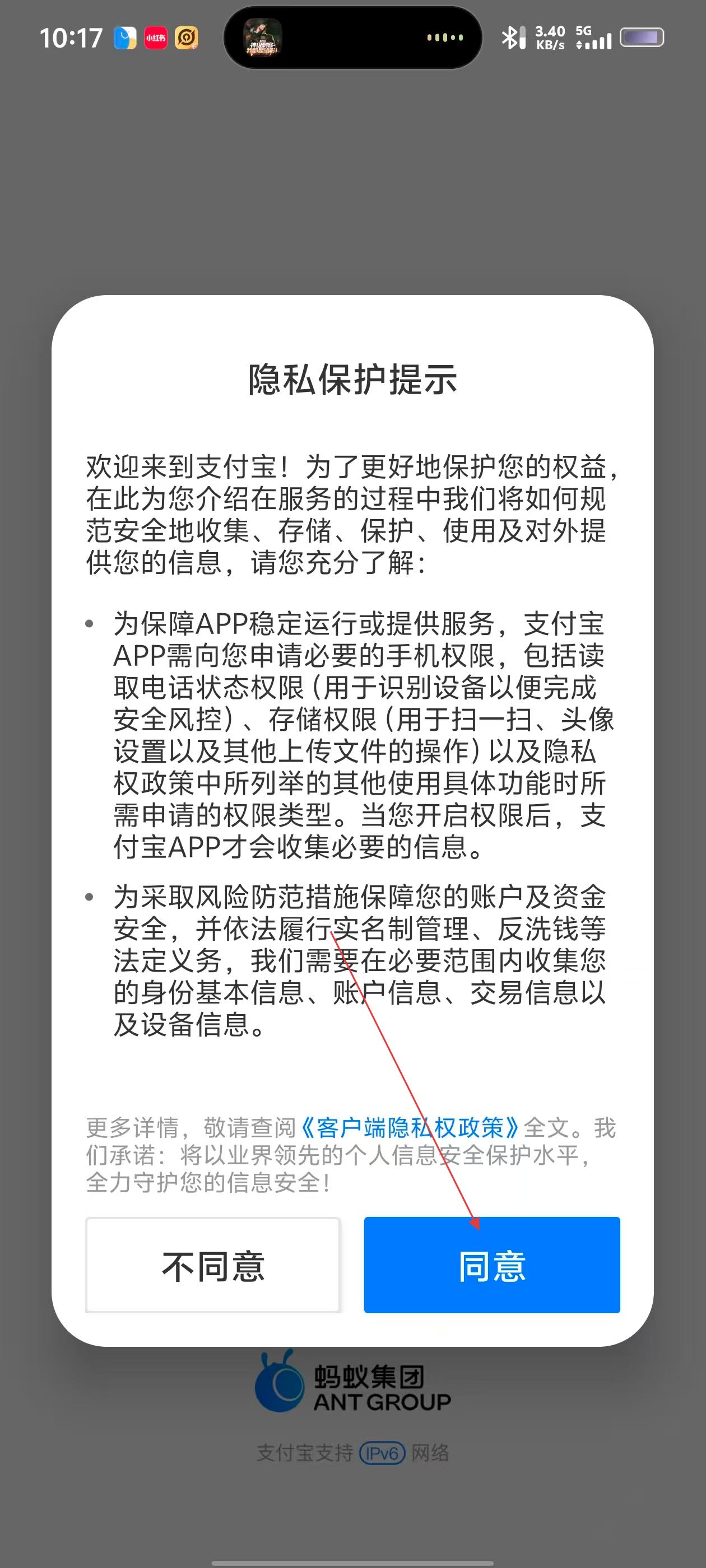 1、打开支付宝APP,看到【隐私保护提示】页面,仔细阅读后点击【同意】按钮,进入后续流程。