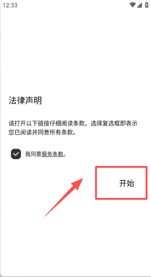1、勾选“我同意服务条款”后点击开始,完成法律声明确认。