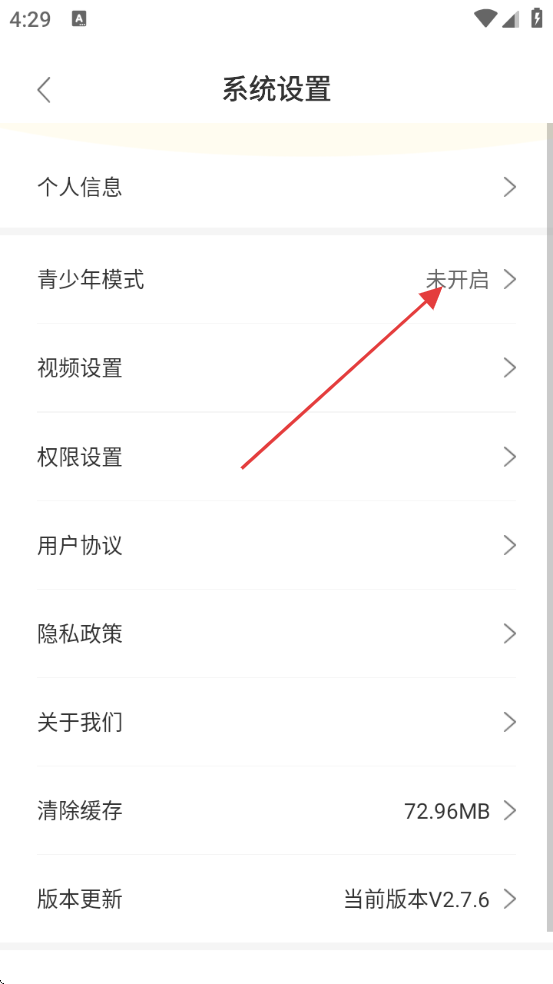 3、在系统设置页面,若要开启青少年模式,点击【青少年模式】,进入青少年模式相关页面。