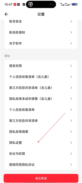 3、在设置界面选择“隐私设置”选项,进入隐私设置页面。