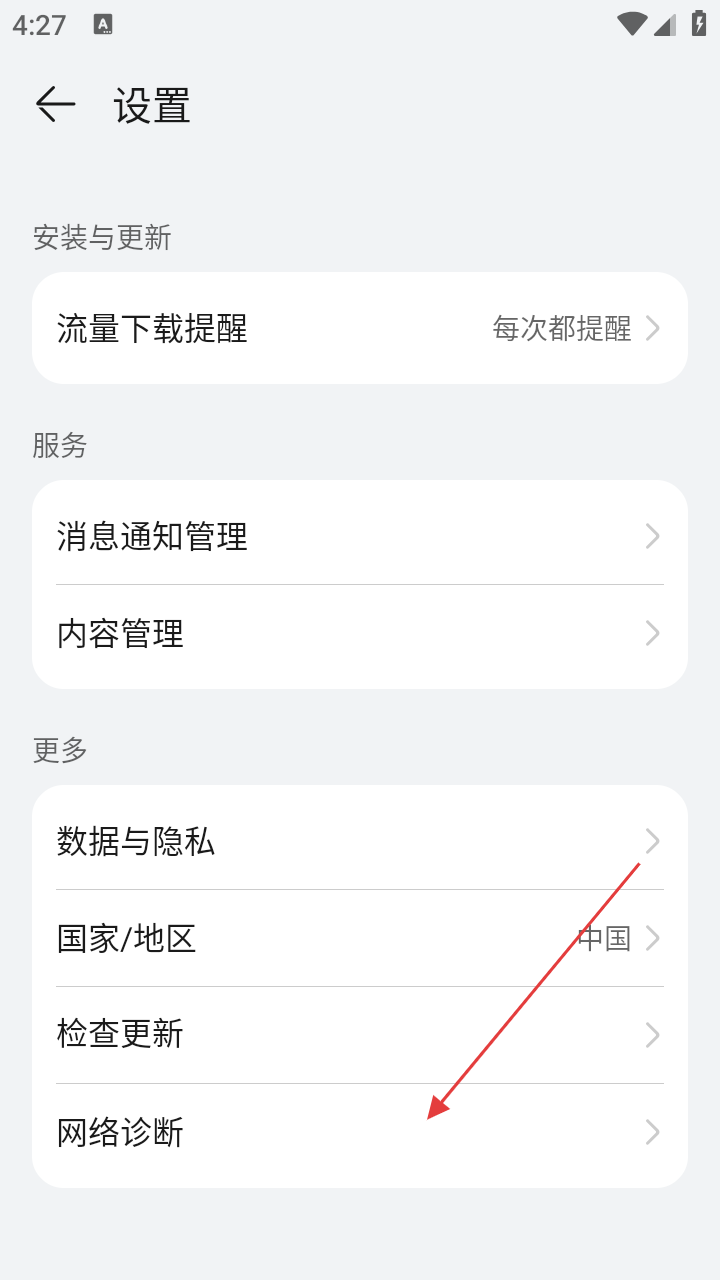 3、在设置界面,点击【网络诊断】进入网络诊断页面,还能对安装与更新、数据与隐私等进行设置。