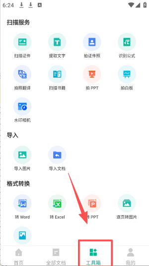 3、在“工具箱”页面,点击“转PPT”进行格式转换。