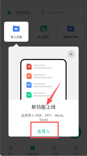 1、点击“去导入”按钮,支持导入PDF、PPT、Word、Excel等格式文档。