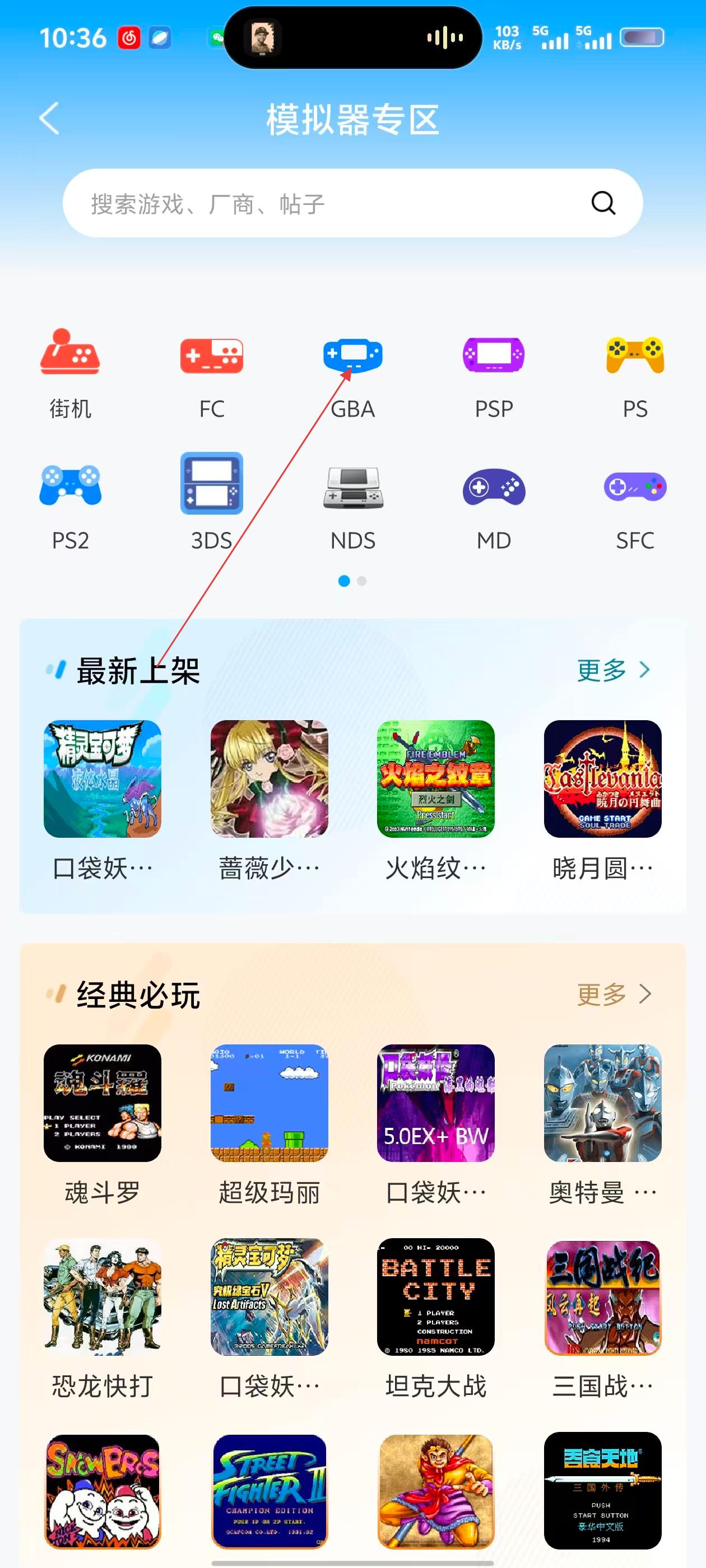 2、进入模拟器专区后,点击【GBA】选项,可进入GBA游戏列表页面。