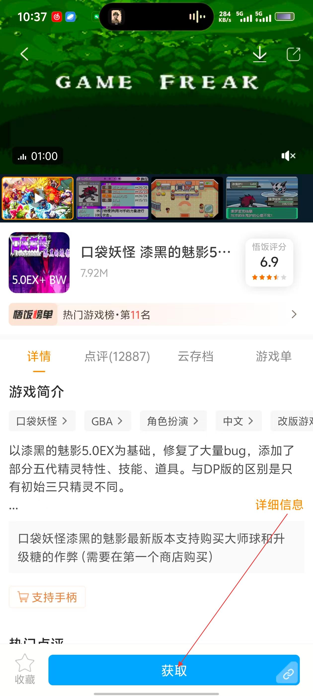 4、进入游戏详情页面后,点击【获取】按钮,即可下载该游戏,开始体验GBA游戏乐趣。