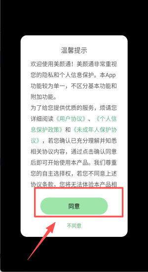 1、阅读温馨提示与用户协议后点同意,授权信息收集以启用美颜通话功能。