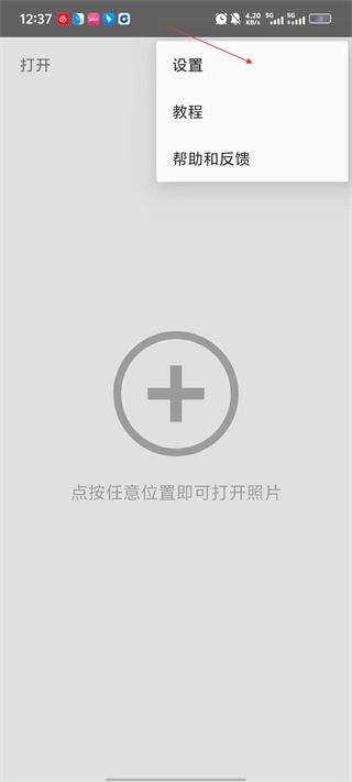 1、在图片打开界面,点击右上角三点图标,可展开功能菜单,查看设置、教程等选项。