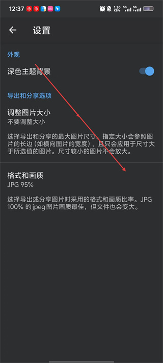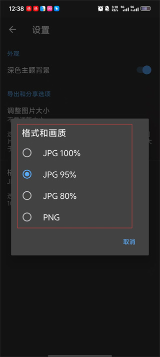 4、点击【格式和画质】选项后,会弹出包含【JPG100%】【JPG95%】等选项的弹窗,可按需选择图片格式与画质。