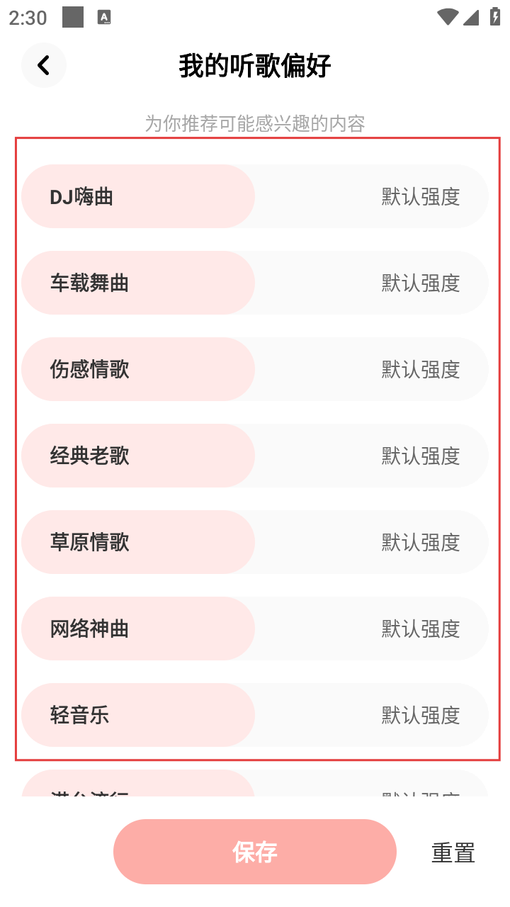 4、在我的听歌偏好页面,可选择DJ嗨曲、车载舞曲、伤感情歌等多种音乐类型,设置完成后点击【保存】按钮,即可完成听歌偏好设置。