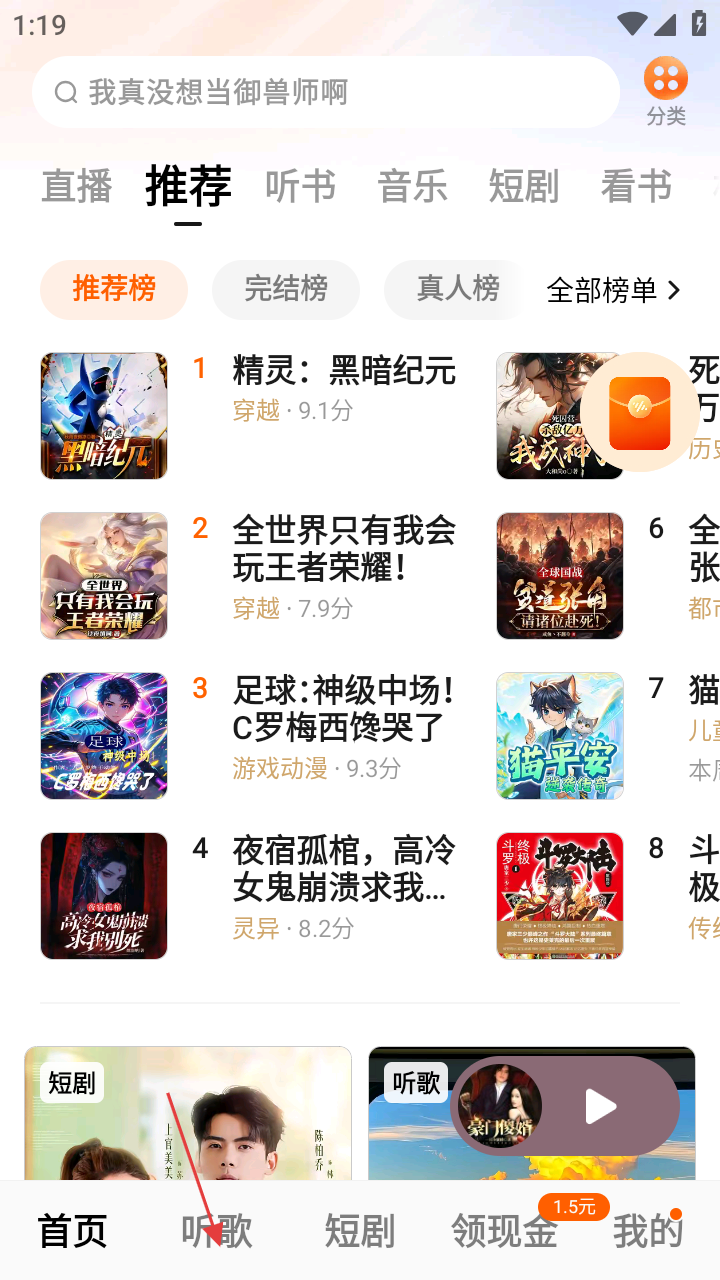 1、在番茄畅听首页,可浏览推荐内容,若想听歌,点击底部【听歌】选项,进入听歌页面。