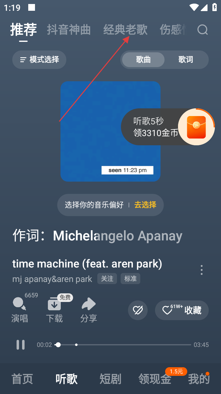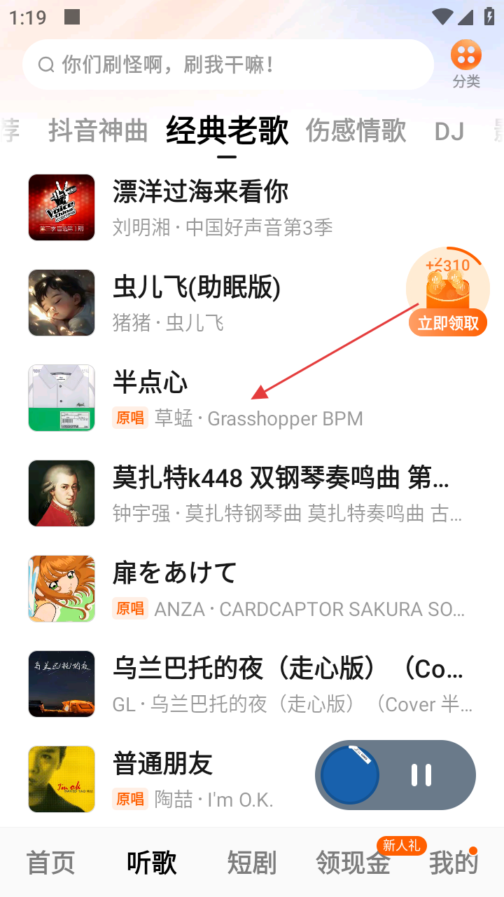 2、进入听歌页面后,上方有【抖音神曲】【经典老歌】等分类,点击【经典老歌】,可查看经典老歌列表。
