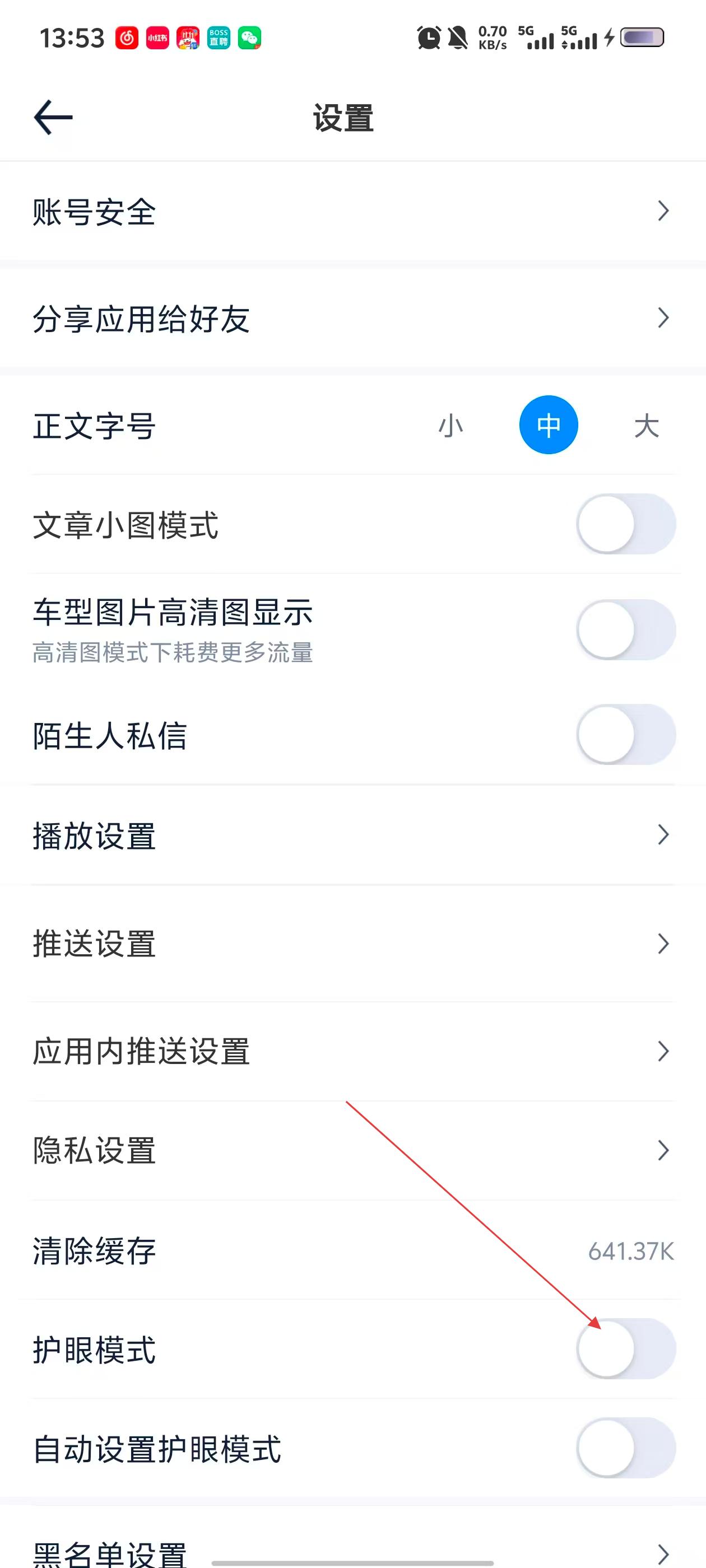 3、在设置界面,可开启【护眼模式】,还能调整正文字号、设置推送等,优化使用体验。