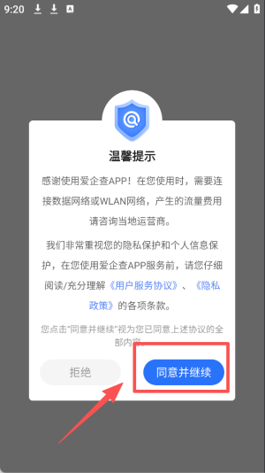 1、同意隐私政策:点击“同意并继续”按钮,接受隐私政策并继续使用应用。