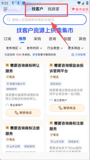 4、查找客户资源:点击“找客户”搜索商机,获取潜在客户和供应商信息。
