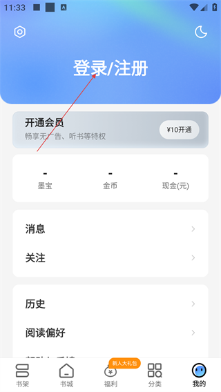 2、在【我的】页面,点击【登录/注册】,可进入登录选择界面。