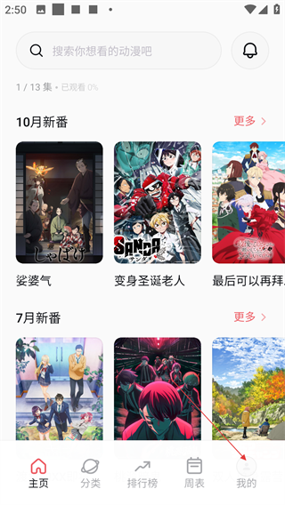 1、进入应用主页,可浏览10月、7月新番等动漫资源,点击底部【我的】选项,进入个人中心页面。