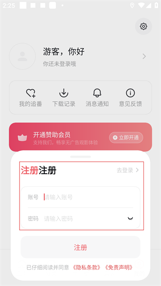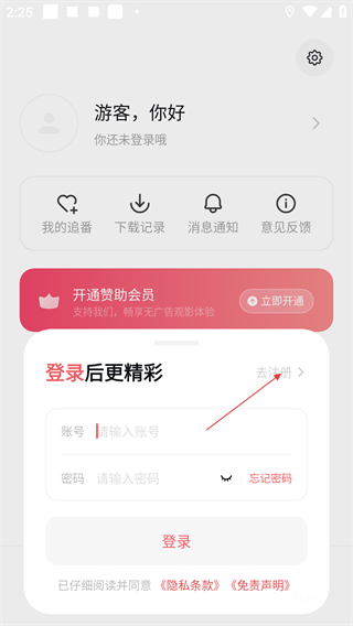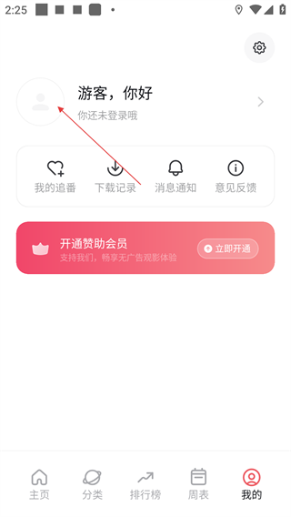 2、在个人中心页面,可看到“游客,你好”的未登录提示,还有【我的追番】【下载记录】等功能入口,点击“你还未登录哦”区域。