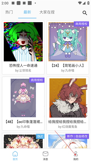 1、在应用首页可浏览“热门”“最新”分类下的捏人作品,通过底部导航栏的“我的”进入个人页面。