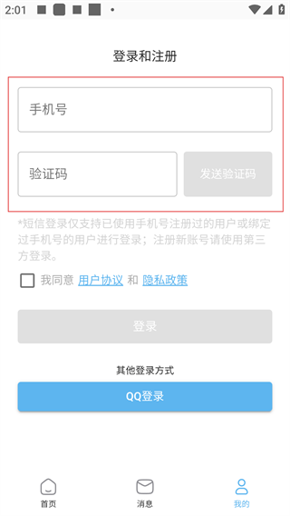 4、退出账号后会进入登录界面,可选择手机号+验证码登录,或通过QQ等第三方方式重新登录。