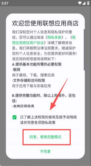 1、阅读隐私条款后点同意,授权联网存储权限开启完整模式。