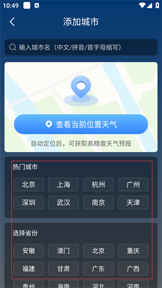 3、在添加城市界面,可通过搜索框输入城市名,或从“热门城市”“选择省份”分类中选择目标城市(如上海)。