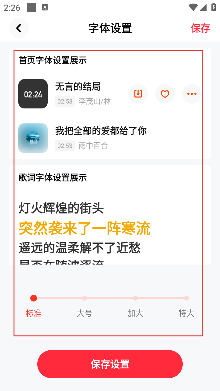 4、在字体设置页面,可调整首页字体和歌词字体的大小,调整后点击【保存设置】或【保存】按钮,即可完成字体设置。