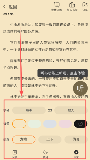 4、阅读设置选项允许用户自由调整界面背景和字体样式,打造最符合个人喜好的阅读环境,让您畅享无阻阅读乐趣。