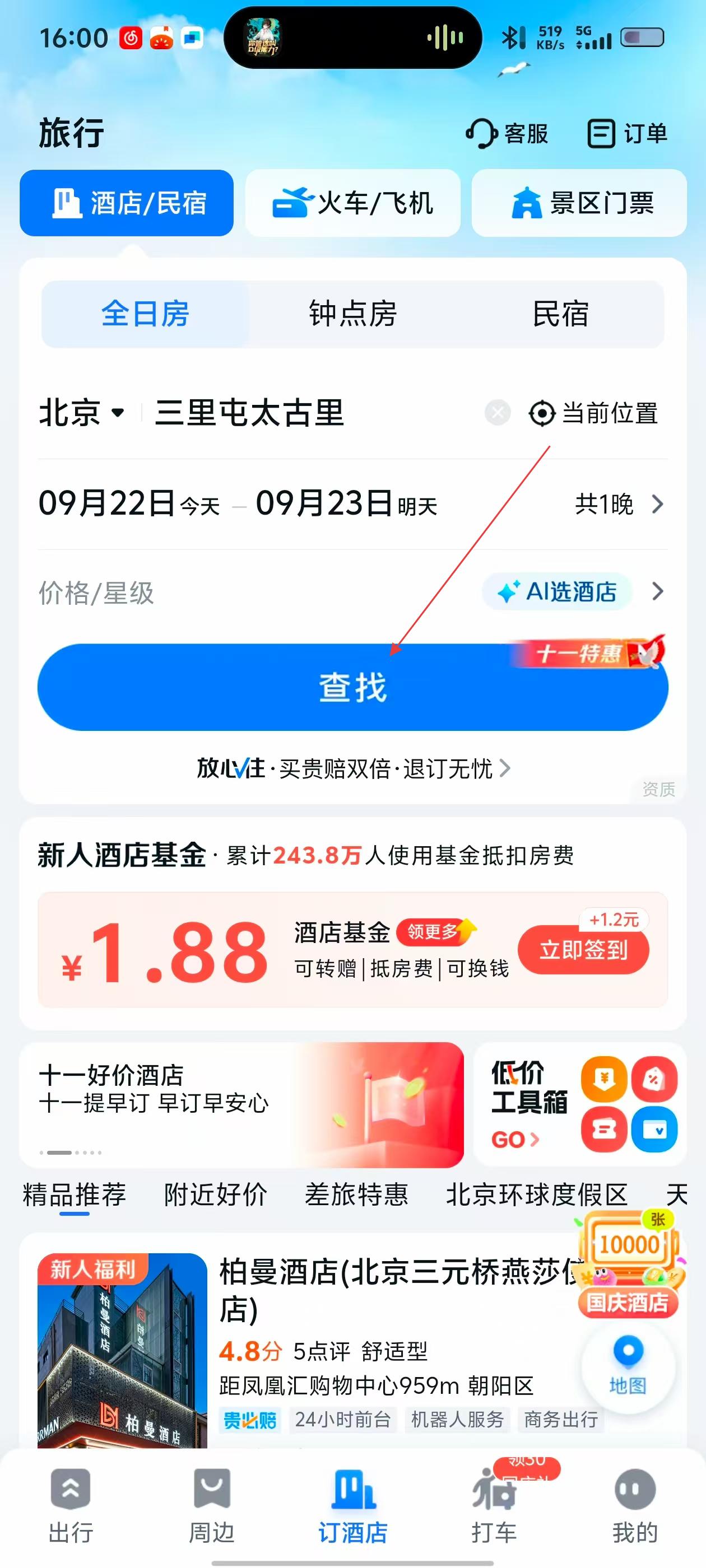 2、进入“旅行”页面的酒店预订板块,选择城市、位置、入住和离店日期等信息,然后点击【查找】按钮。