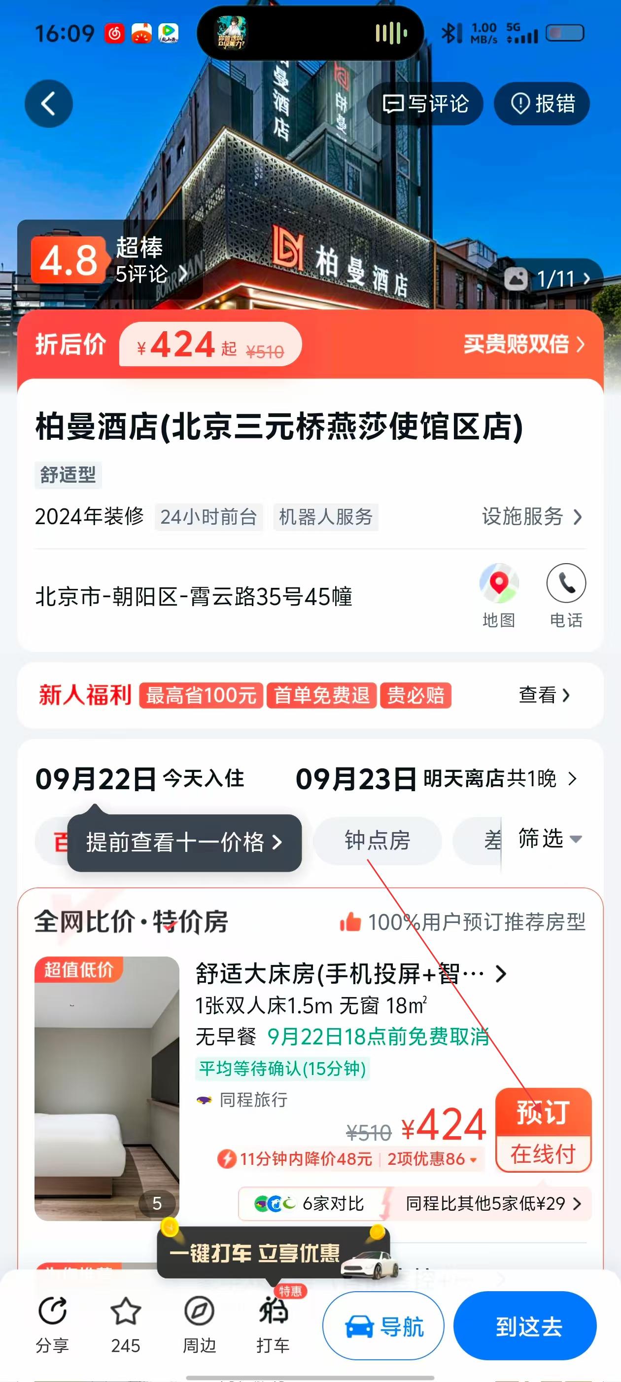 4、在酒店详情页,查看酒店的设施服务、房型价格等信息,选择合适的房型,点击【预订】按钮,按照提示完成酒店预订操作。