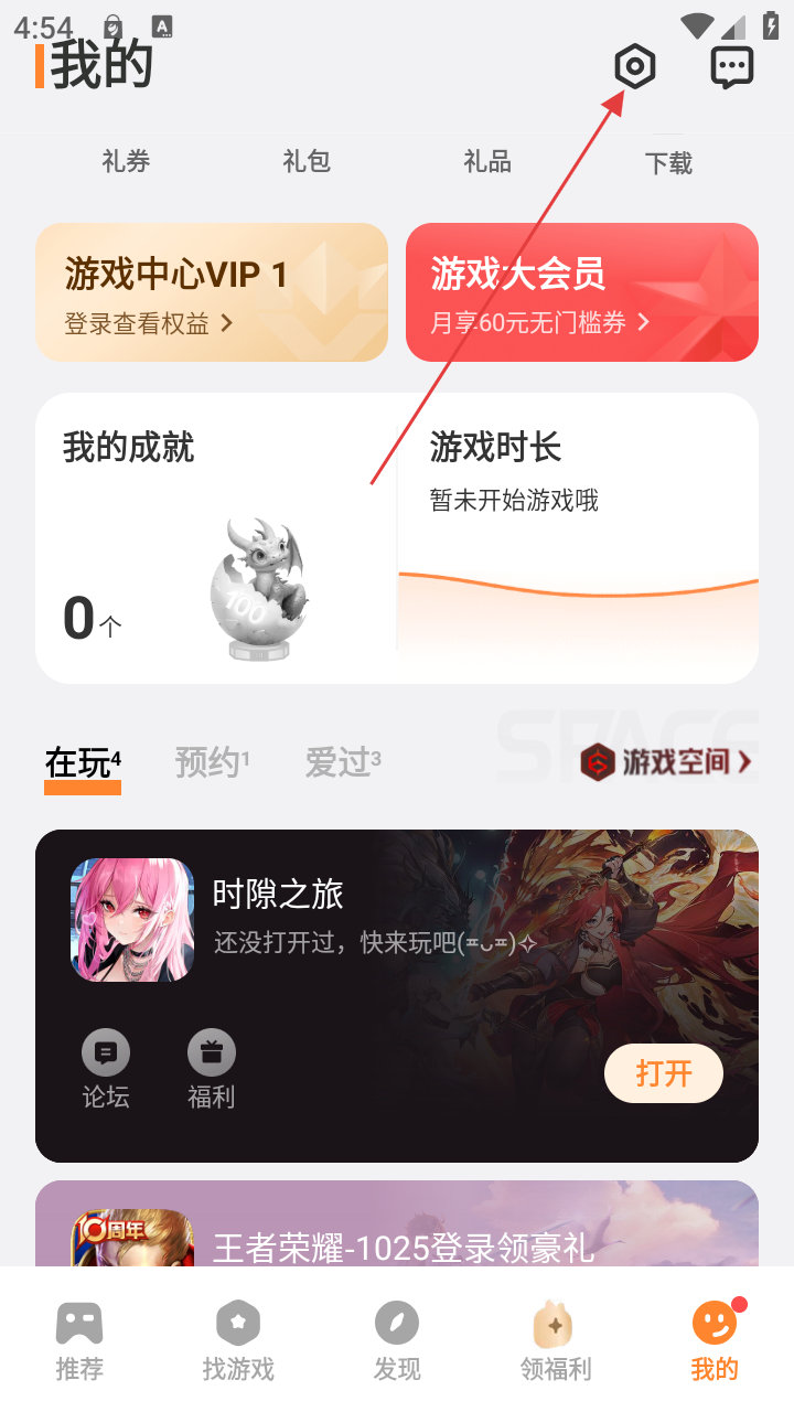 2、在【我的】页面,点击设置图标可进入设置界面,还能查看礼券、礼包等信息,享受游戏中心VIP和游戏大会员权益。