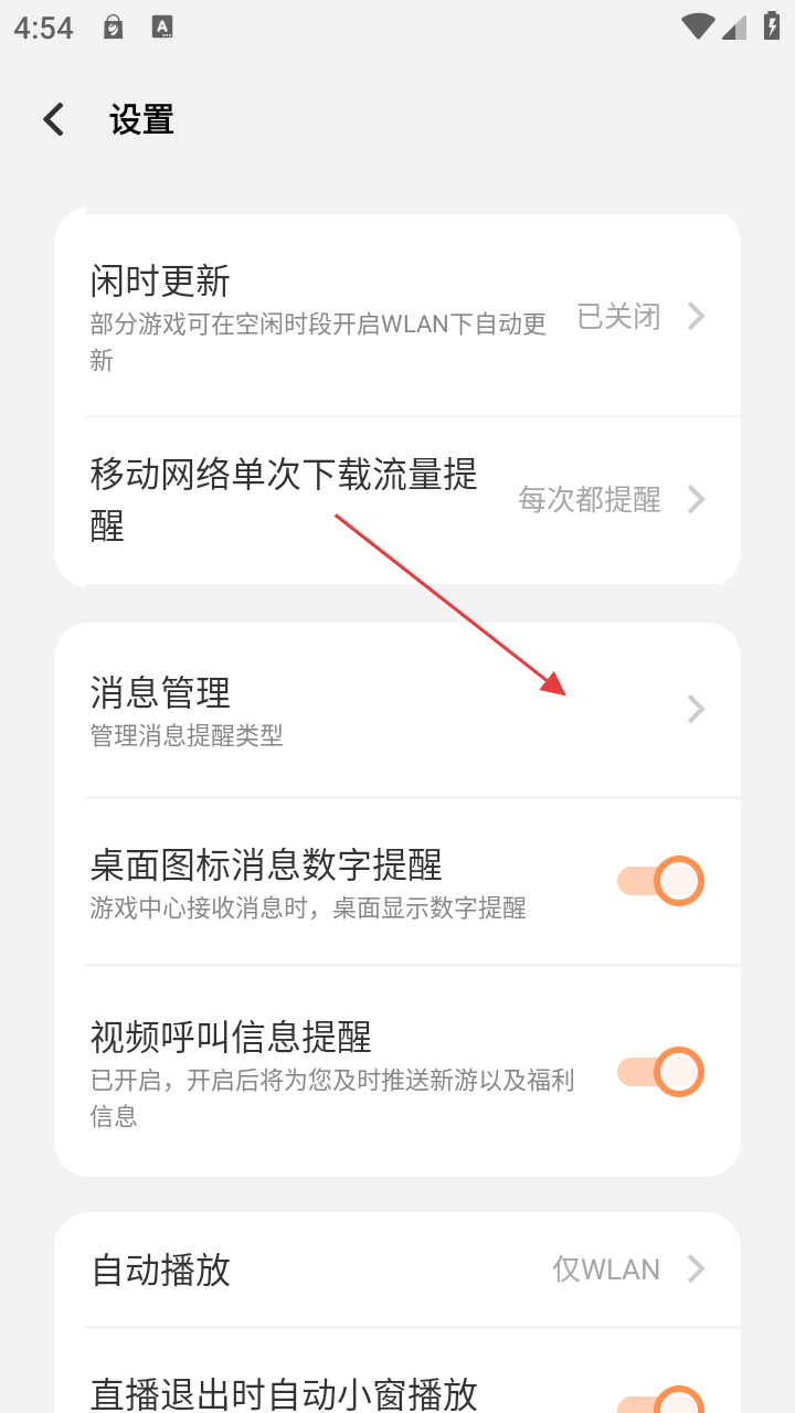 3、在设置界面,点击【消息管理】可进入消息管理界面,可对游戏安装完成提醒、游戏更新提醒等各类消息通知进行设置。