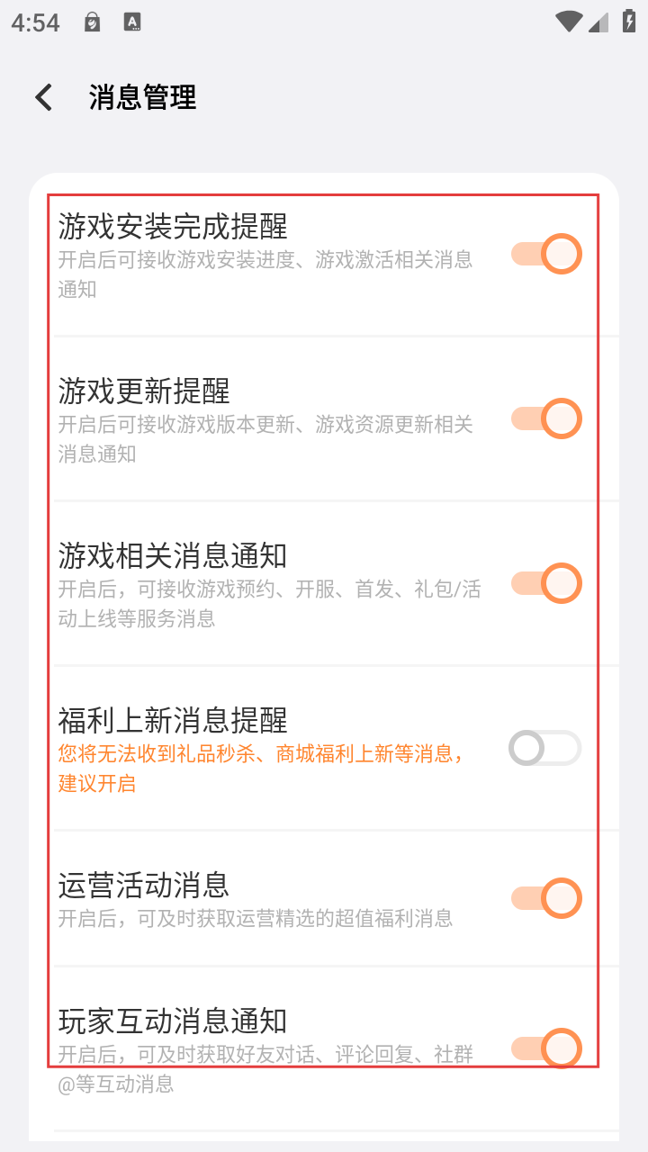 4、在消息管理界面,可根据需求开启或关闭游戏安装完成提醒、游戏更新提醒等消息通知,以便及时获取游戏相关信息或减少消息干扰。