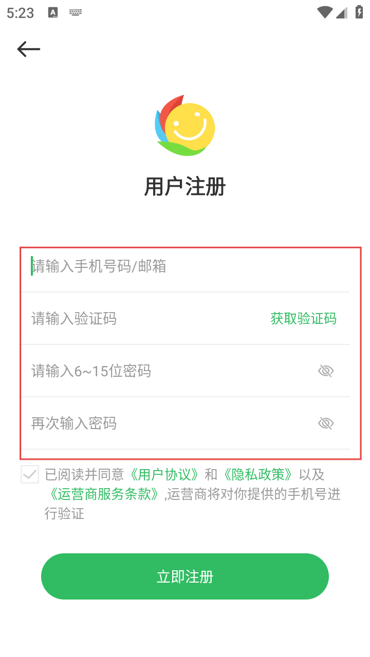 4、在用户注册页面,依次输入手机号码/邮箱、验证码、密码,勾选同意协议后点击【立即注册】,完成用户注册操作。