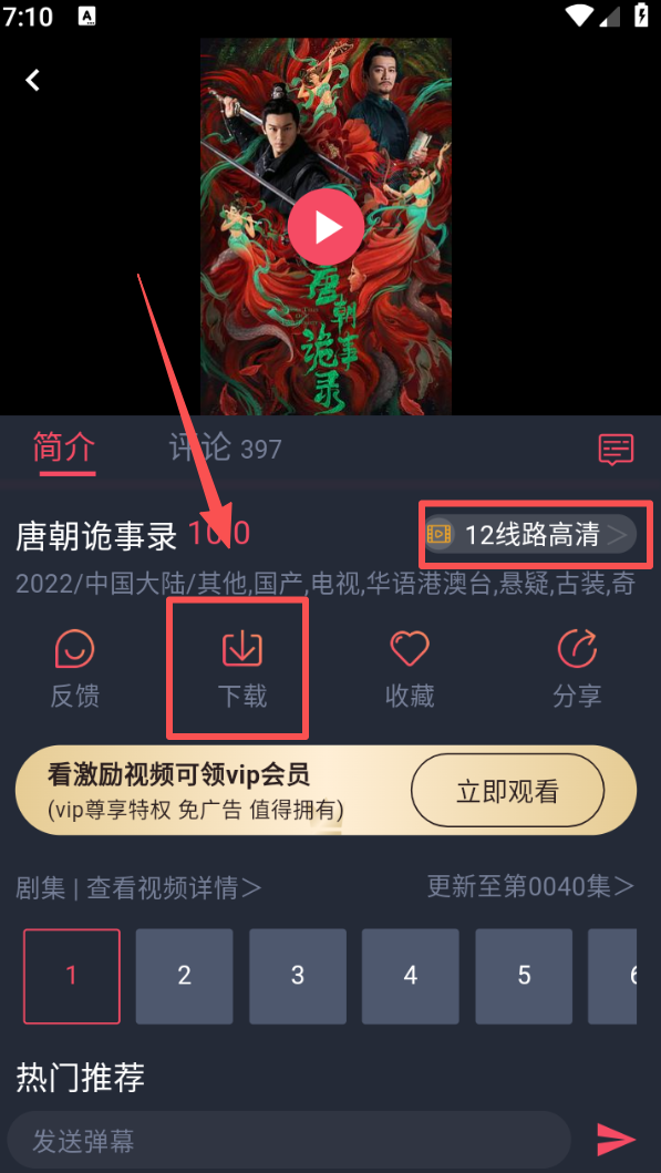 3、进入播放页后,可选择 “下载” 功能缓存内容,也能切换播放线路,选择对应集数开始观看。