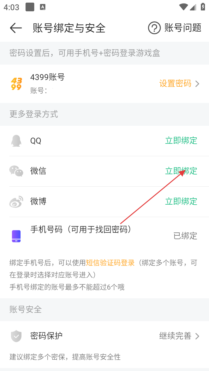 4、在账号绑定与安全设置页面,可选择QQ、微信等进行绑定,也可设置密码,提升账号安全性。
