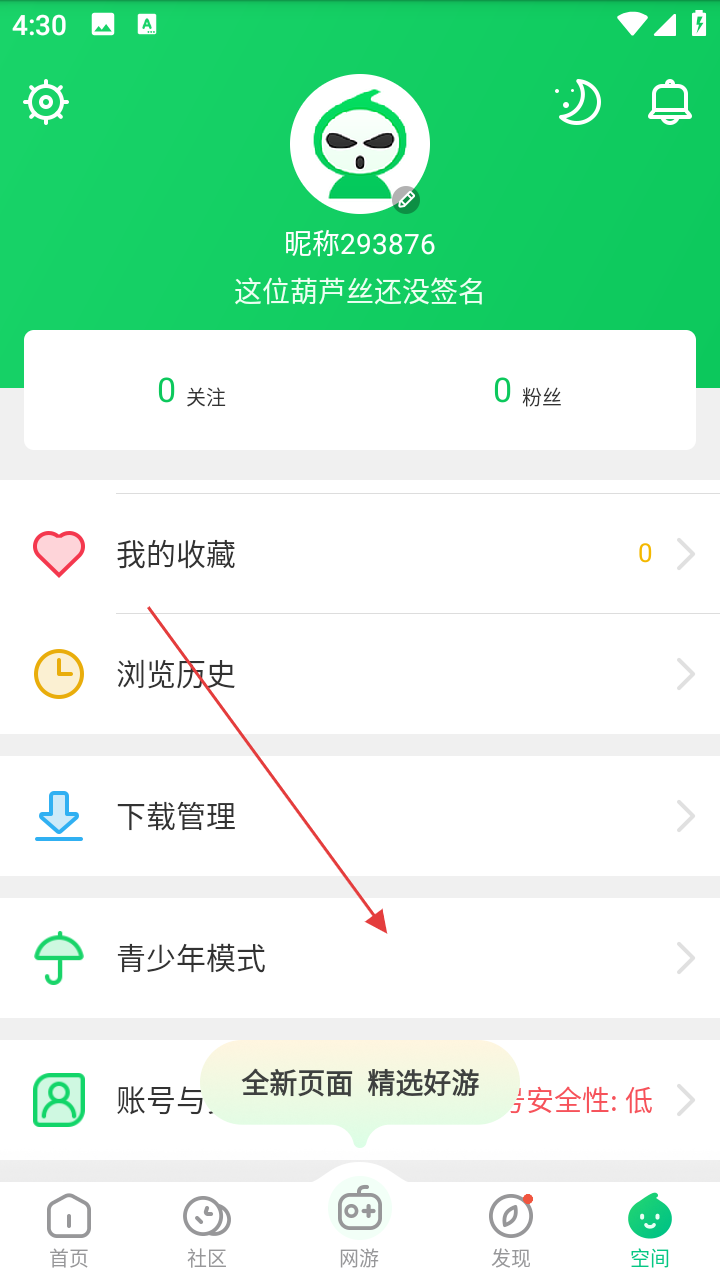 2、进入个人空间后,点击【青少年模式】选项,可进入青少年模式设置页面。