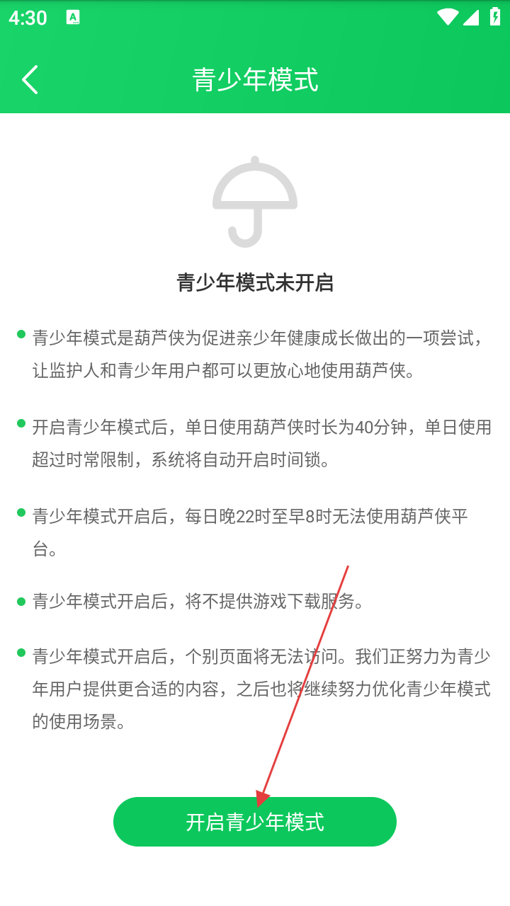 3、在青少年模式设置页面,可查看模式相关说明,点击【开启青少年模式】按钮可开启该模式。