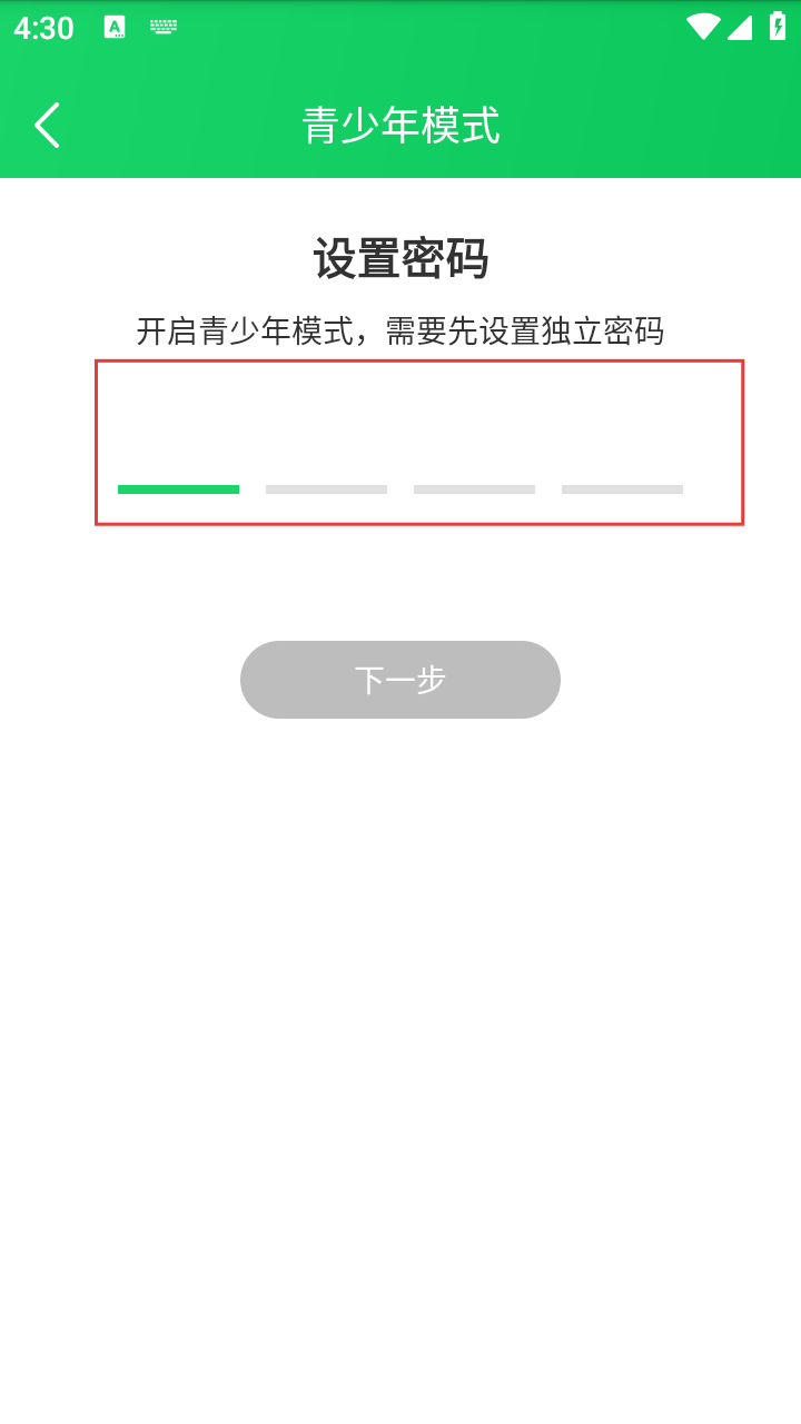 4、开启青少年模式时,需先设置独立密码,按提示输入密码后点击下一步即可完成设置。
