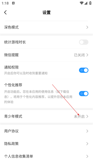 3、设置页面中,选择【青少年模式】选项,进入对应界面。