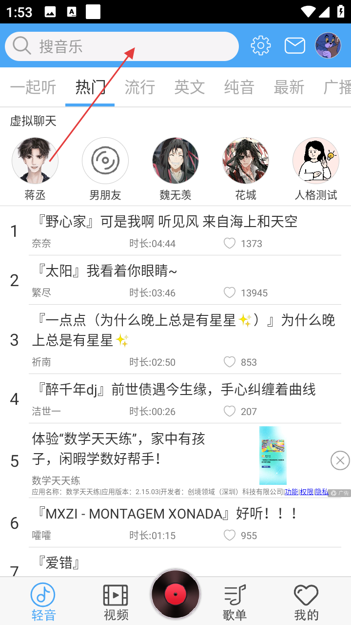 1、在轻音社主界面,若要搜索音乐,点击顶部的搜索框。
