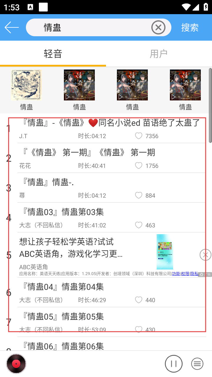 3、比如输入【情蛊】并搜索,会展示相关的轻音内容列表。