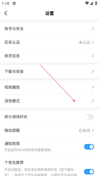3、设置页面中,选择【深色模式】选项,进入对应界面。