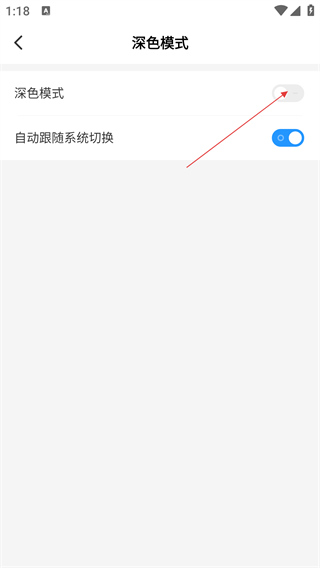 4、在深色模式界面,点击“深色模式”右侧的开关按钮,即可手动开启深色模式。