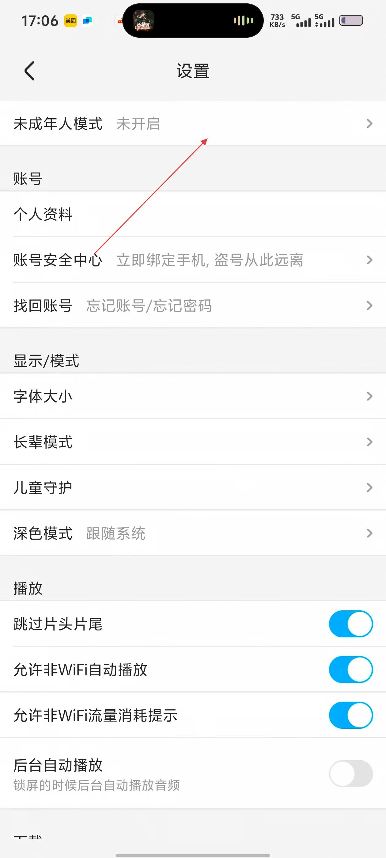 3、在设置页面,有【未成年人模式】【账号安全中心】等选项,点击【未成年人模式】,进入相关页面。