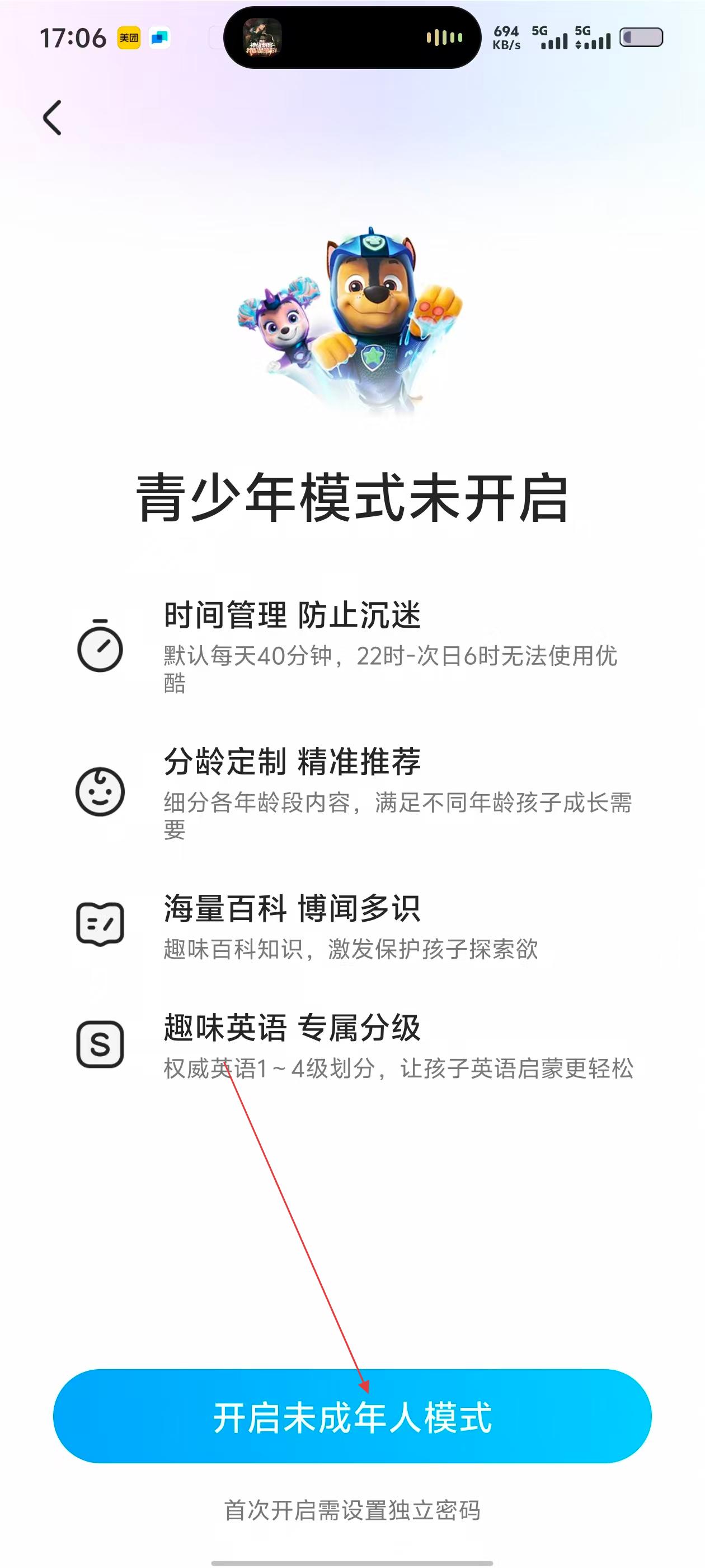 4、在未成年人模式页面,可看到模式相关介绍,点击【开启未成年人模式】,即可开启该模式。