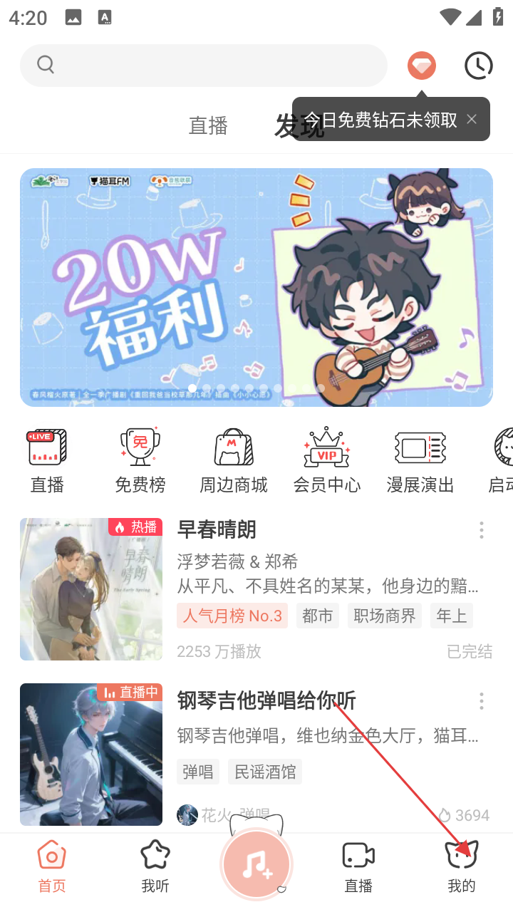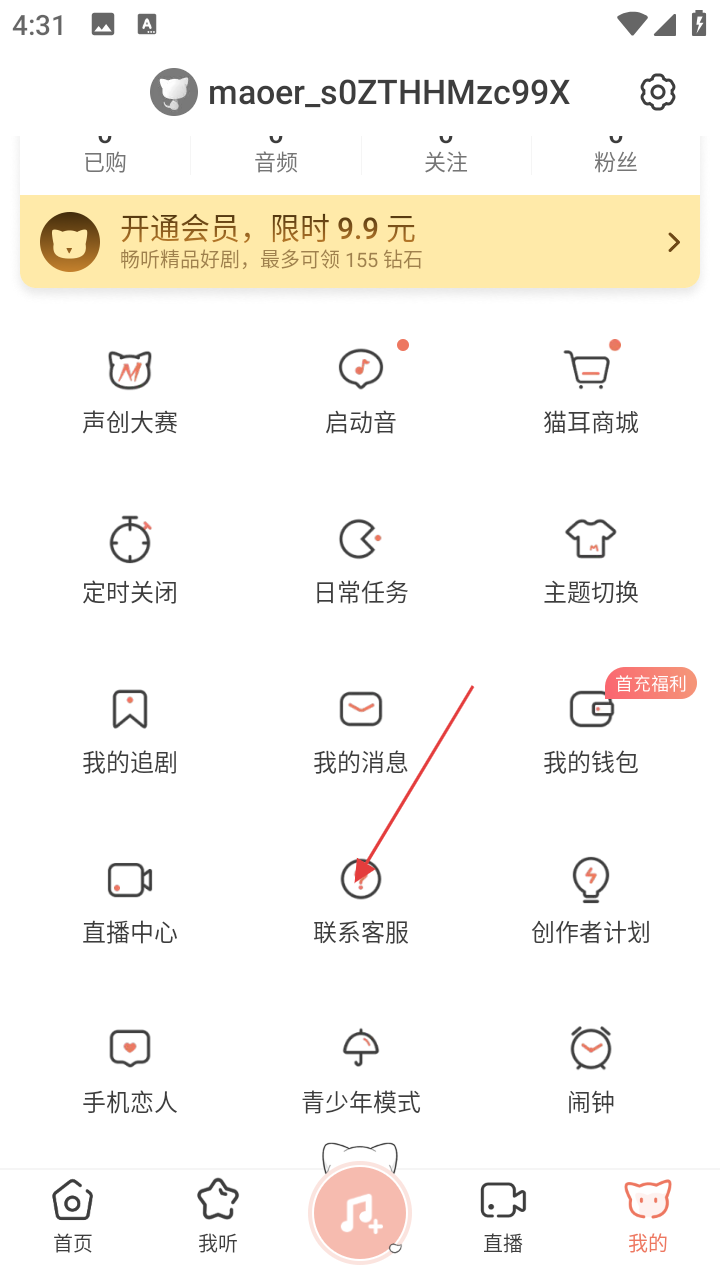 1、在猫耳FM首页,点击底部【我的】,进入个人中心页面,可查看各类功能入口。